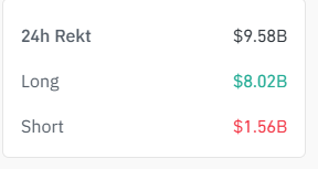 Traders who went long on crypto suffered $8.03 billion in losses, while those trying to short the market added $1.57 billion to the count.