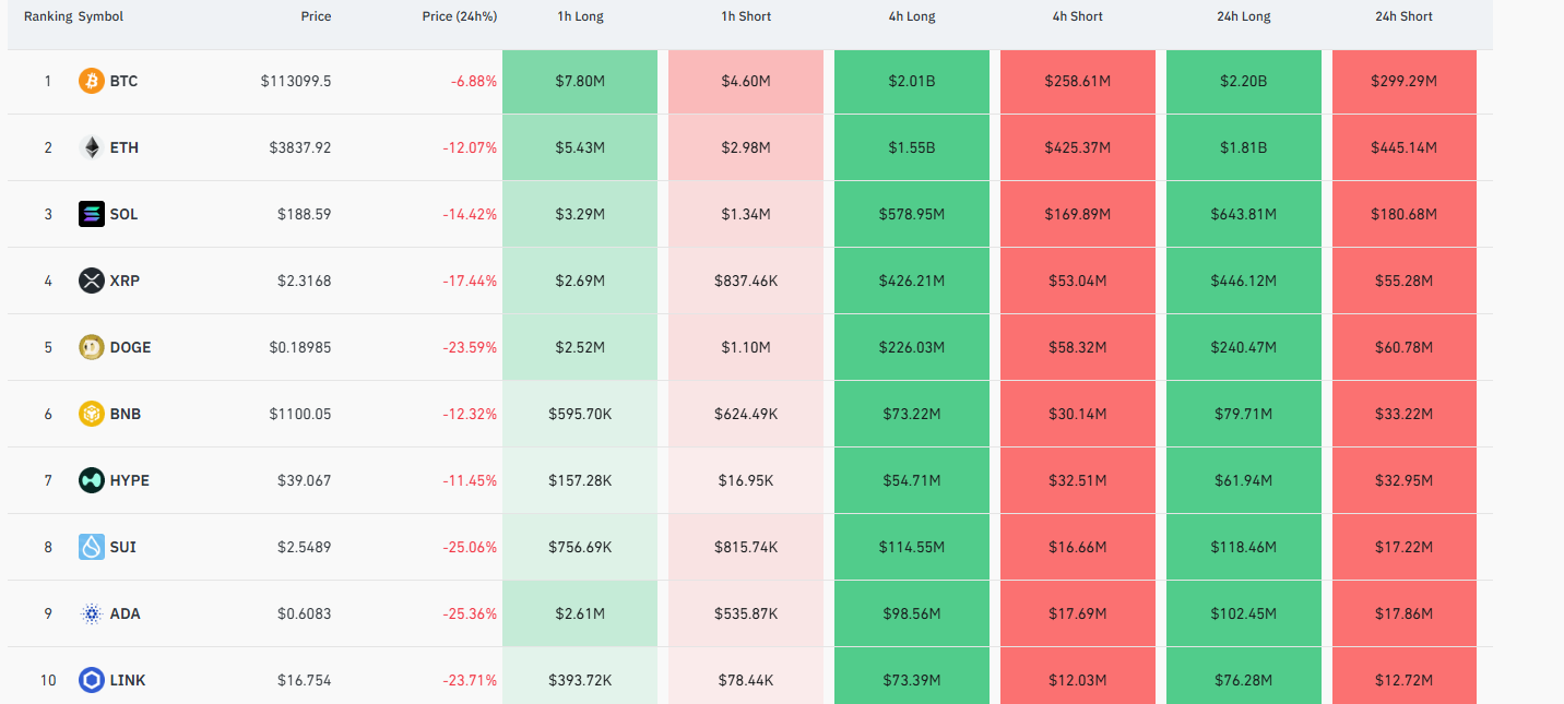 Leading the list is Bitcoin (BTC) with $2.20 billion in longs and nearly $300 million in shorts liquidated in the last 24 hours. Ethereum (ETH) comes in at number two with $1.81 billion in longs and $445.14 million in shorts liquidated over the same stretch. Solana (SOL) traders saw liquidations amounting to $643.81 million in longs and $180.68 million in shorts in the past day.