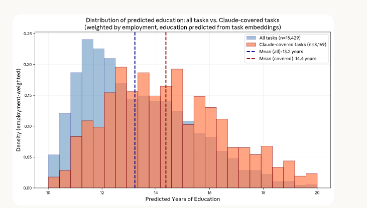 “Claude is relatively more likely to cover the tasks that require higher education levels, specifically tasks that require an average of 14.4 years of education, relative to the economy’s average of 13.2.”