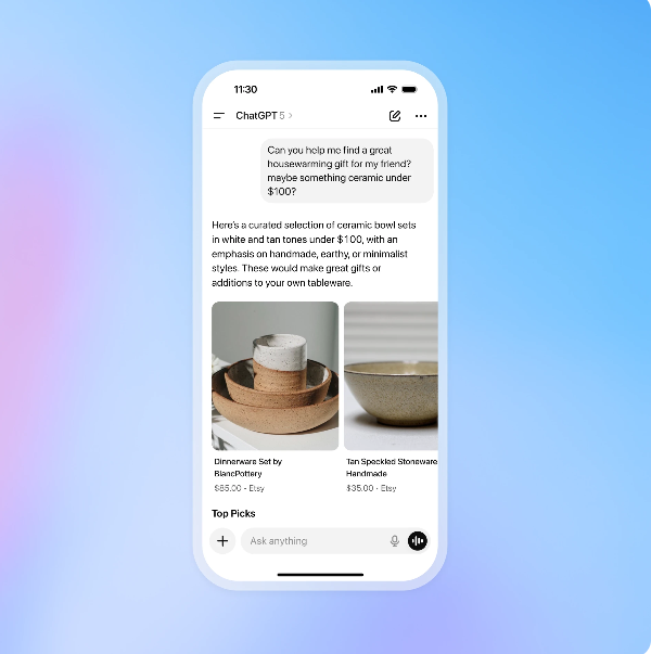 “ChatGPT acts like a personal shopper. People describe what they’re looking for—’a durable carry-on under $300′  and ChatGPT recommends the most relevant products from across the web. Any merchant can be discovered.