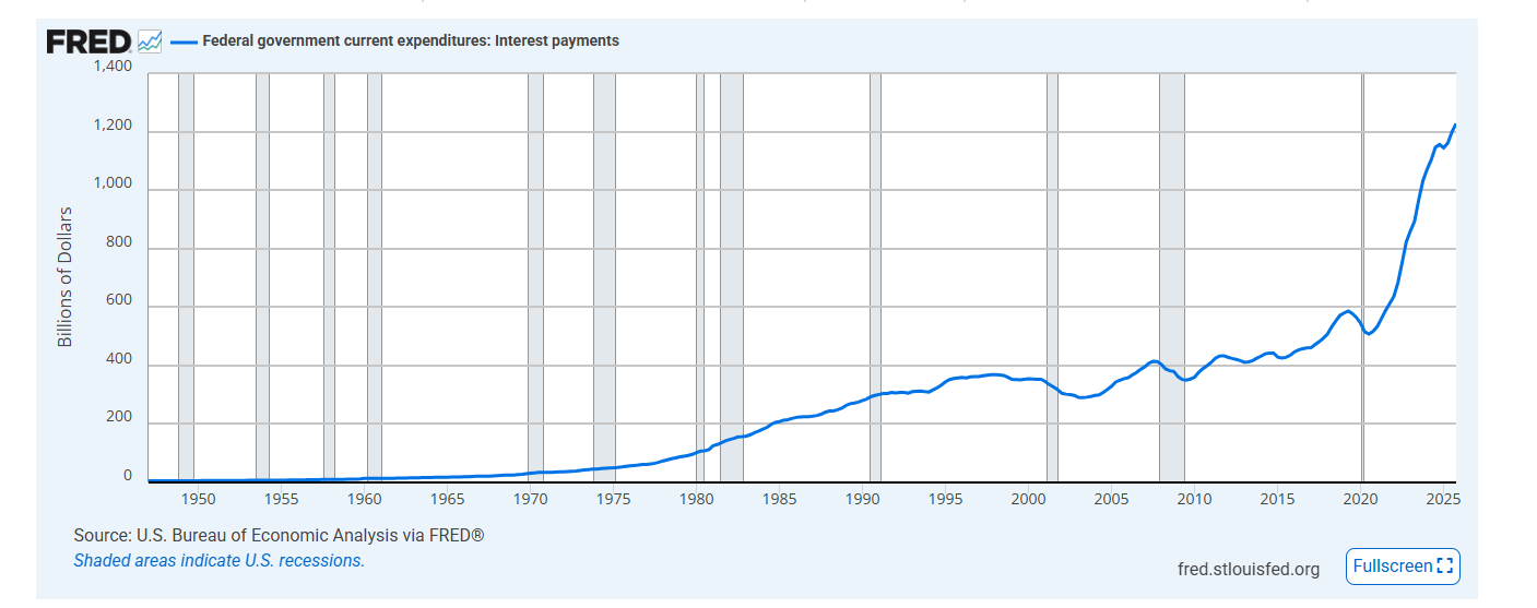“Well, the US now is at 20% of revenue, a little higher than that, but it rounds down to 20% of revenue going to interest expense. So our revenue is $5.4 trillion. Our budget is about $7.3 trillion. So if there’s that big deficit in there of $1.9 trillion, that’s going to keep being ladled on. And the interest expense is already $1.2 trillion.”