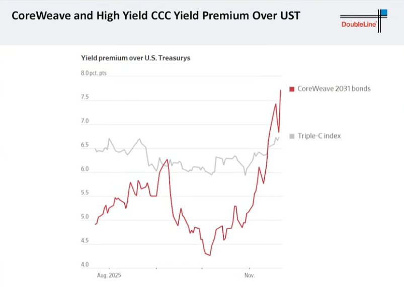 Gundlach adds that similar signals are now appearing in the AI-linked infrastructure play CoreWeave, where credit spreads have moved far more aggressively than the broader high-yield market.