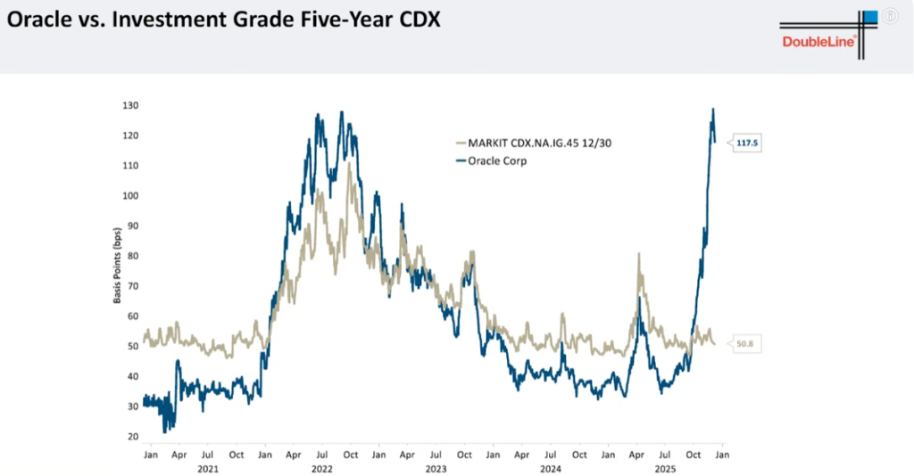 Gundlach highlights Oracle as a key example, noting that its credit performance has sharply diverged from the broader credit default swap index that it typically tracks.