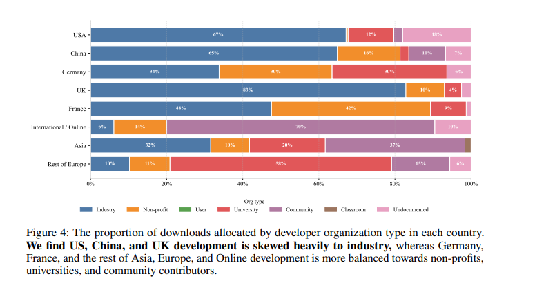 Looking at the segments that download AI models, the researchers find that the bulk of US downloads come from industry at 67%, followed by undocumented at 18% and university at 12%. In China, 65% of model downloads come from industry, nonprofit (16%) and community (10%).