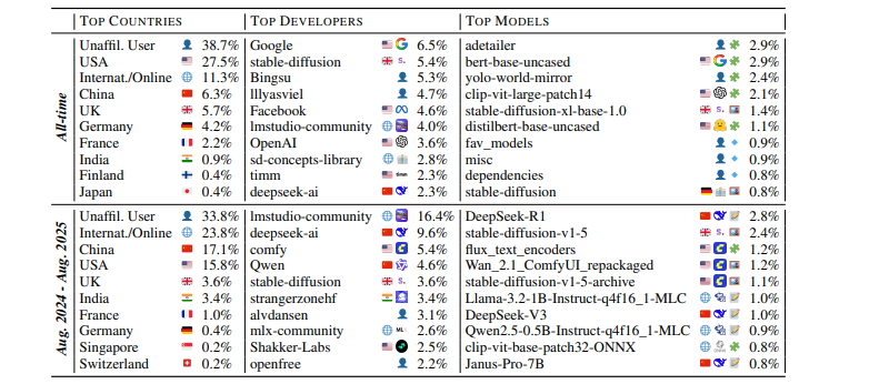 The MIT study, which analyzed 851,000 models and 2.2 billion downloads, shows Chinese developers running ahead of the US in raw download counts.