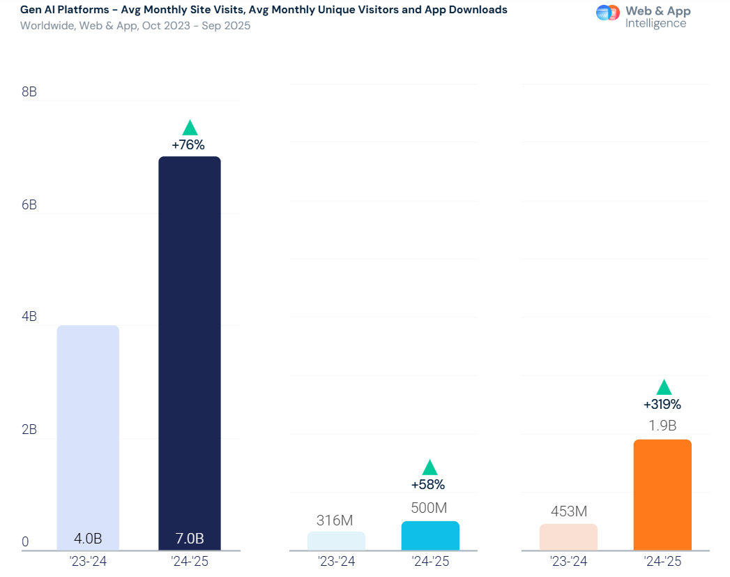 In its 2025 Generative AI Landscape: From Platforms to Pathways report, market intelligence firm Similarweb finds that generative AI monthly web visits have soared to 7 billion per month on average from October 2024 to September 2025.
