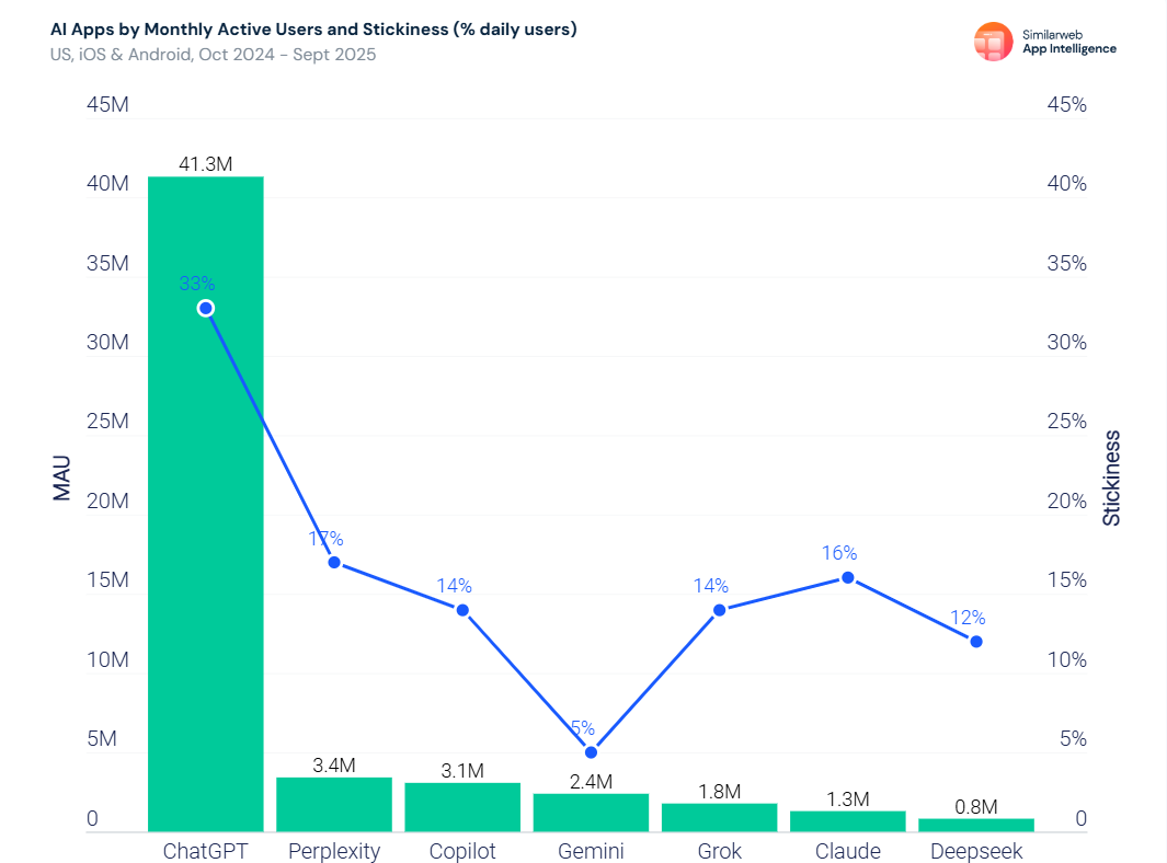 “Generative AI apps are dividing into two camps: large-scale tools driving habitual use and smaller players serving specialized needs. With over 41 million monthly active users in the US and a 33% stickiness rate, ChatGPT outpaces competitors by a wide margin, reflecting not just popularity, but daily reliance…