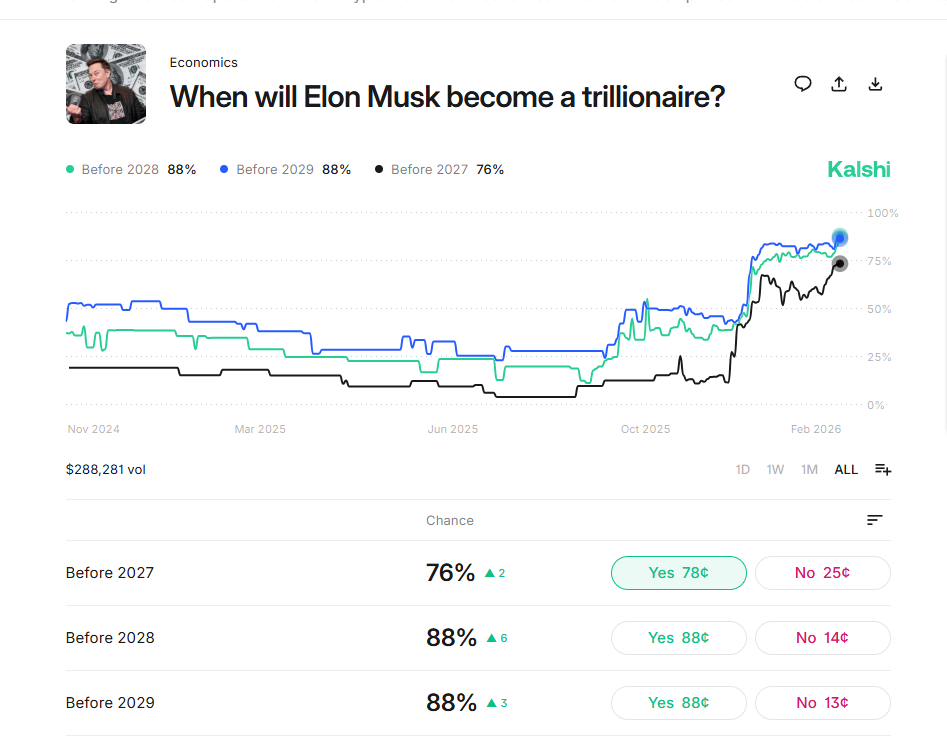Traders at Kalshi are increasingly betting that Musk will become a trillionaire, giving the scenario 76% odds of happening before January 1st, 2027.