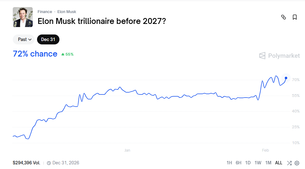 Traders are increasingly betting that Musk will hit the major milestone following SpaceX’s acquisition of Grok creator xAI for $250 billion. Forbes reports that SpaceX is now worth $1.25 trillion, boosting Musk’s net worth by $84 billion to a record $800 billion. Musk, the richest person on the planet, is $200 billion shy of hitting trillionaire status.