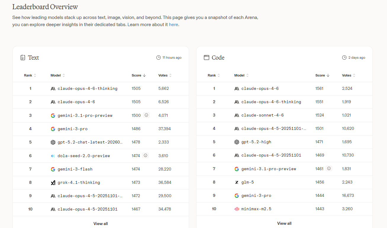 The LMArena AI leaderboard shows that users rank Claude Opus 4.6 Thinking as the best model for text and Claude Opus 4.6 as the number one model for coding. Meanwhile, Grok 4.1 Thinking sits at the eighth spot for text, and it ranks 41st for coding.
