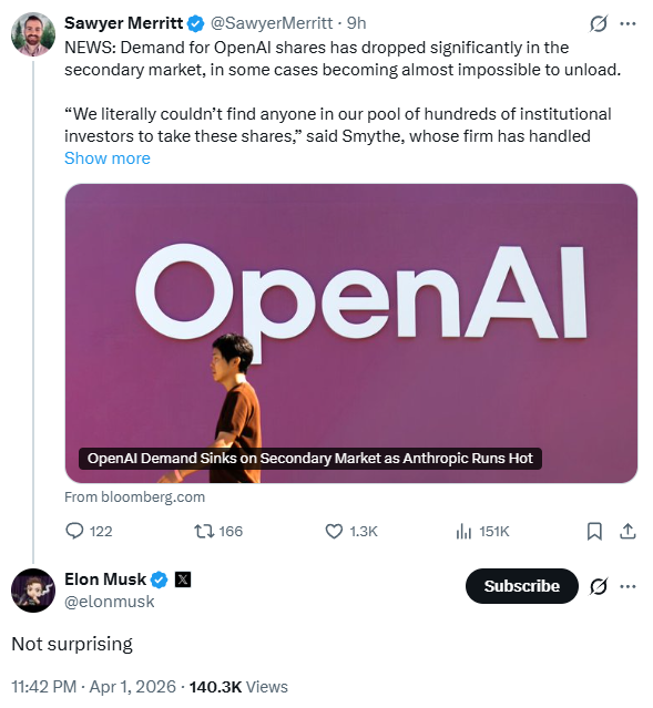 News of institutions struggling to find takers of OpenAI shares in the secondary market caught the attention of Elon Musk on X. He says the development is “not surprising.”