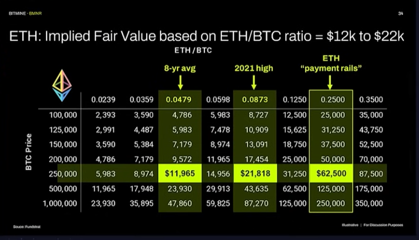 Lee says that he’s looking at the potential dollar upside for Ethereum if Bitcoin hits his $250,000 price target.