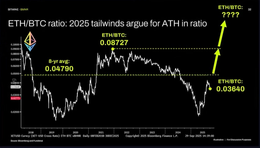 At the TOKEN2049 event in Singapore, Tom Lee says he’s keeping an eye on the performance of Ethereum against Bitcoin (ETH/BTC).