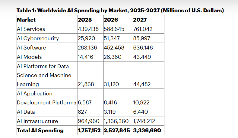 Building out and updating the tools and systems supporting frontier models comes at a distant second, with an estimated $588.64 billion in spending this year. AI software comes in at number three at $452.45 billion, and cybersecurity ranks fourth at $51.34 billion.
