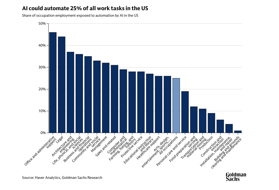 According to Briggs, 300 million jobs worldwide are at risk of AI automation, while in the US, about 25% of all work hours can be automated by AI.
