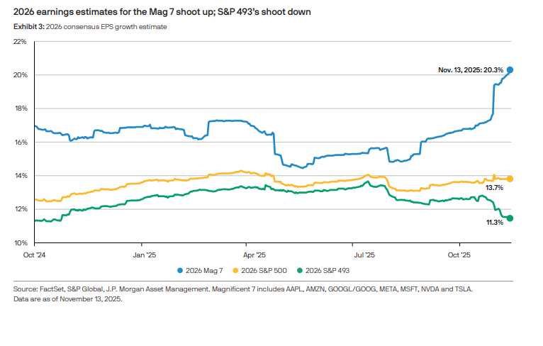 The bank also predicts that Mag 7 names will outrun other companies in the S&P 500 in terms of earnings next year. JPMorgan predicts earnings estimates for the Mag7 will shoot up to 20.3% next year, while the S&P 493 will grow at about 11.3%.