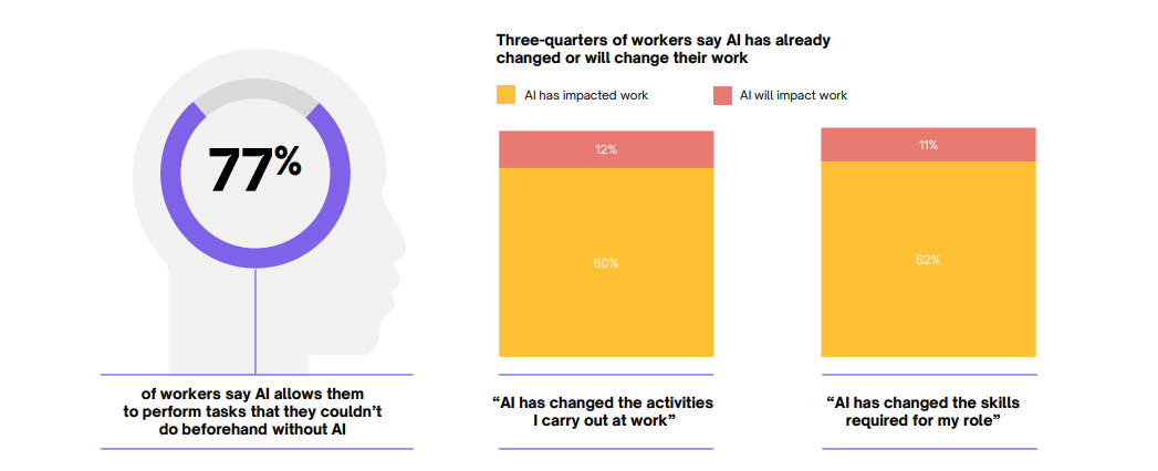 “Workers seem to be largely embracing the changes caused by AI, with 77% saying that AI has allowed them to perform tasks they couldn’t do before they had access to the technology. This is positive, because nearly three-quarters say that AI has already changed – or they expect it to change – the activities they do and the skills they require for their role.”