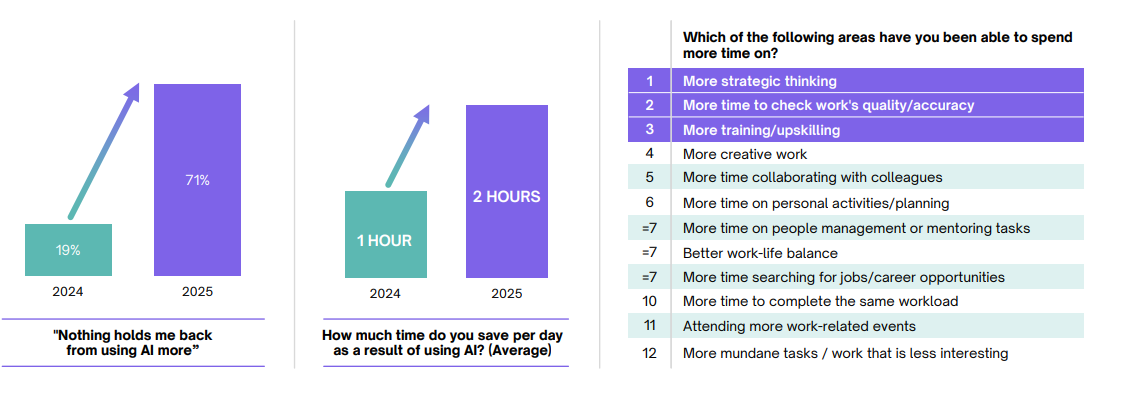 The study also finds that AI is making employees more efficient, allowing them to save time on their tasks. Employees now estimate they save about two hours per day using AI, double last year’s average. Yet Adecco cautions that this time gain often fails to translate directly into measurable productivity for employers, as employees mostly spend the freed-up time on more strategic thinking, quality assurance and training/upskilling.