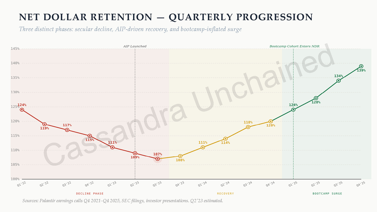 “If Palantir’s business model is working, that NDR should never be falling. Rising NDR is the entire architecture of the model.”