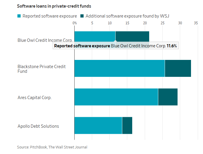 An analysis by the Wall Street Journal shows that four large private credit funds – Blue Owl, Blackstone, Apollo and Ares Capital – have an average software exposure of 25%, almost twice as much as advertised.