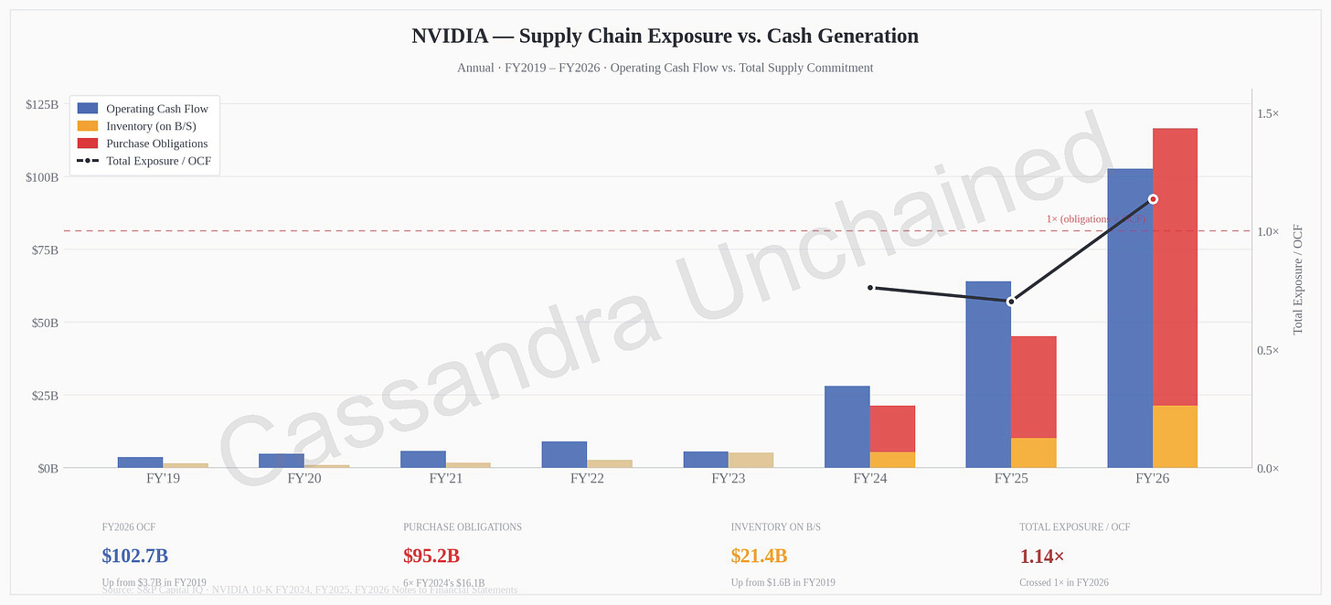 “Rather than a business that would normally roll comfortably through the hills and valleys of its industry, the weighty supply obligation relative to earnings and cash flow makes a valley more of a potential entity risk for Nvidia. Any downturn, when it comes, will be more severe, perhaps even catastrophic, for Nvidia’s earnings and balance sheet.”