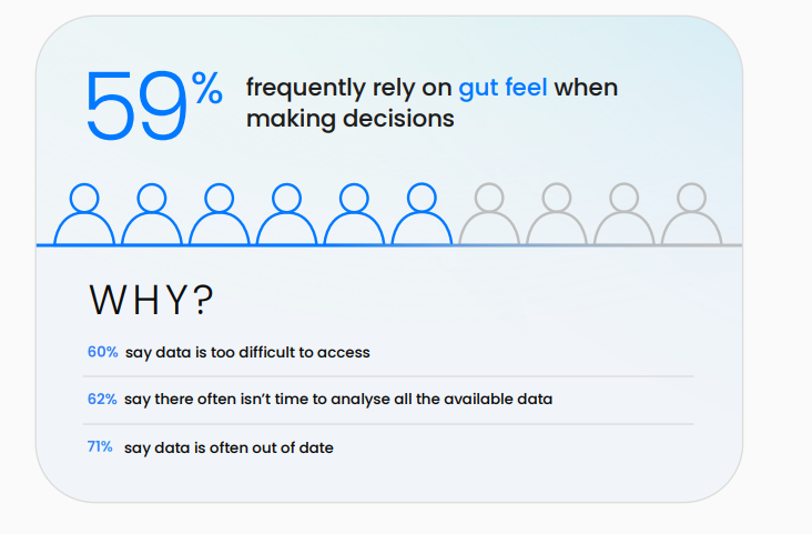 More than half of the executives surveyed, about 59%, say they frequently rely on gut instinct when making decisions. Meanwhile, 60% say the data they need is difficult to access, and 71% say the information they receive is already outdated by the time it reaches them.