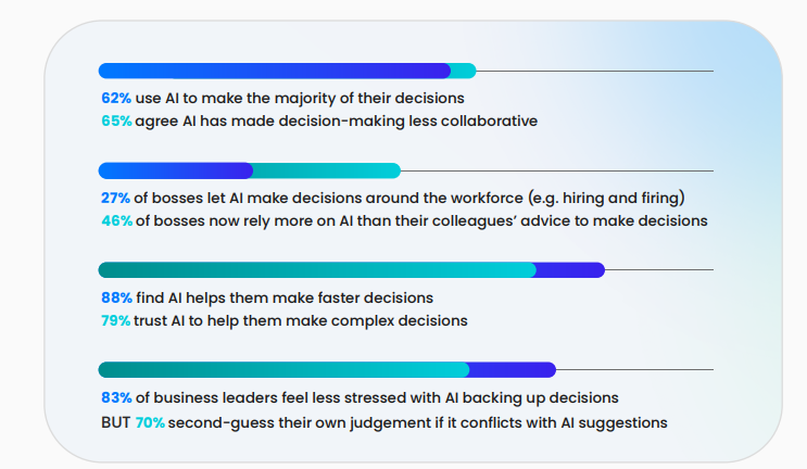 About 70% of executives say they now second-guess their own instincts if they conflict with AI recommendations, and nearly half, about 46%, say they now rely more on AI than on advice from colleagues when making decisions.
