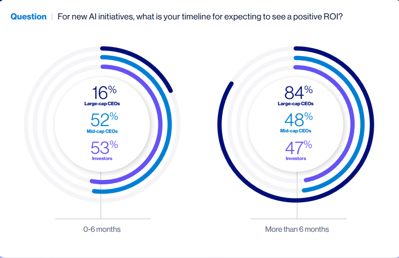 More than half of investors now expect new AI initiatives to deliver returns within six months or less. Only 16% of large-cap CEOs believe that the timeline is realistic. Mid-cap CEOs are more aligned with investor expectations, reflecting greater flexibility and shorter implementation cycles.