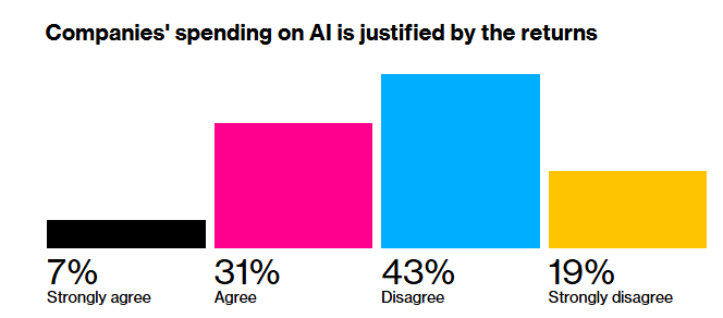 The latest Markets Pulse survey reveals that 62% of respondents disagree or strongly disagree that companies’ AI spending is justified by the returns, reports Bloomberg.