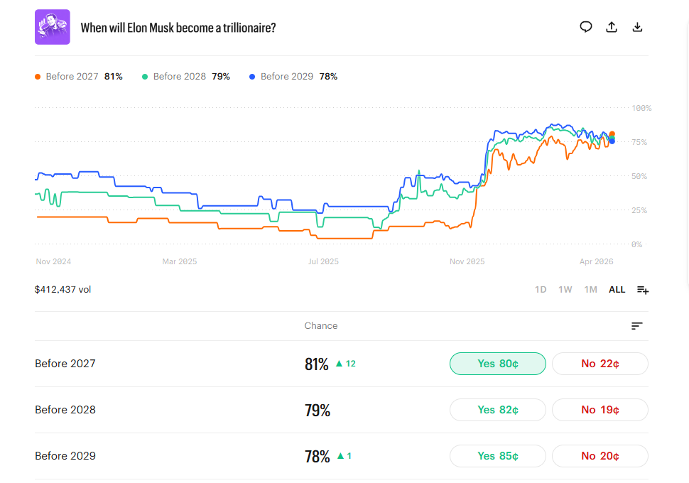 Odds of Elon Musk becoming the first-ever trillionaire soared following the news. Data from the prediction market Kalshi shows 81% odds of Musk becoming a trillionaire by 2027, up from just 71.6% before the news broke.