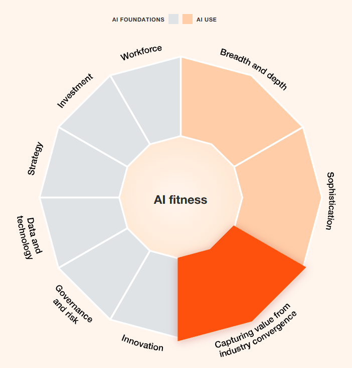 AI leaders are more likely to use AI to derive growth from industry convergence, the strongest AI fitness factor influencing AI-driven performance.”