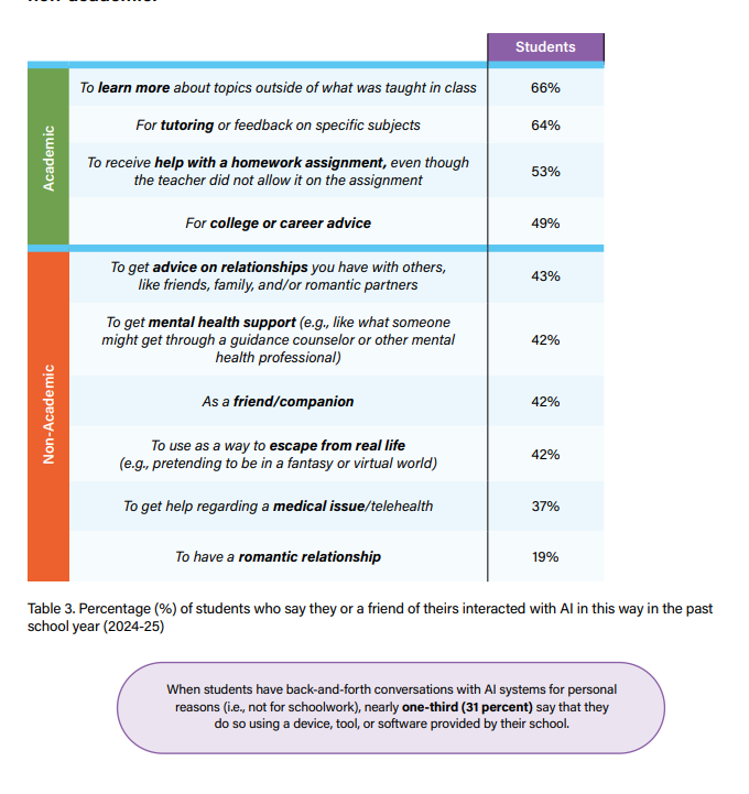 Roughly 43% of students said AI was used for advice on relationships with friends, family or romantic partners. About 42% reported using AI for mental health support, as a companion or friend or as a way to escape real life through fantasy or virtual interaction. Meanwhile, 19% explicitly said they or a peer had used AI to form a romantic relationship.