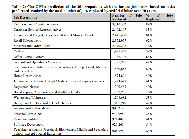 “According to the ChatGPT-based model, artificial intelligence and automation could replace nearly 100 million jobs over the next ten years, including 89% of fast food and counter workers, 64% of accountants and 47% of truck drivers.”