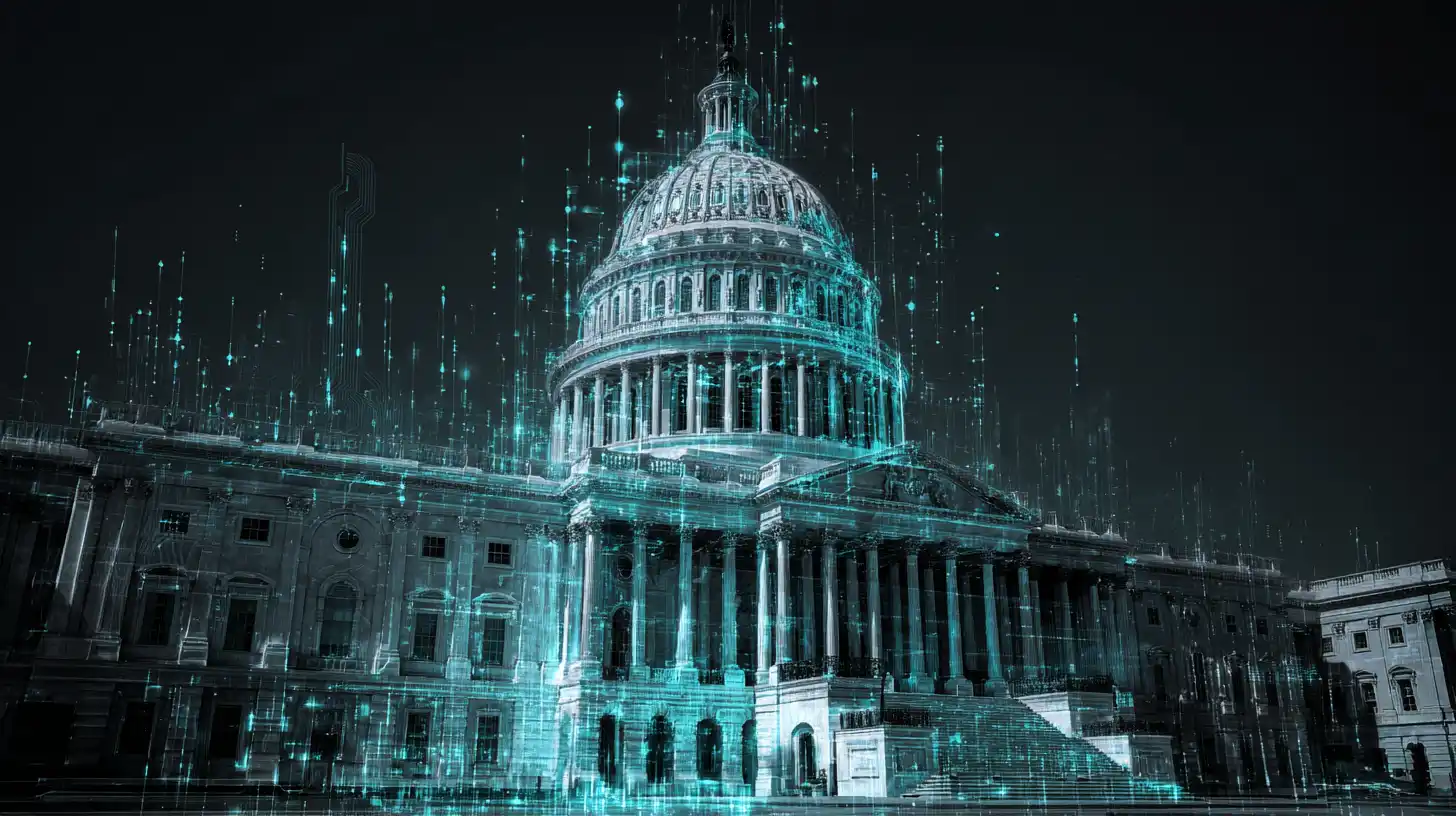 US Capitol building glowing with silver and teal AI circuit overlays, symbolizing a congressional probe into Meta’s artificial intelligence policies.