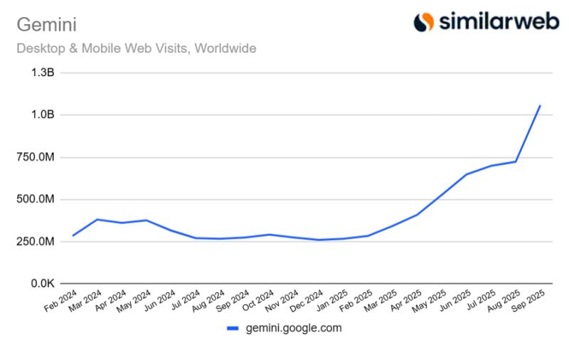 Recent data from Similarweb shows visits to gemini.google.com climbed past 1.1 billion in September 2025, a sharp acceleration that underscores how deeply Gemini is beginning to embed itself in Google’s ecosystem.