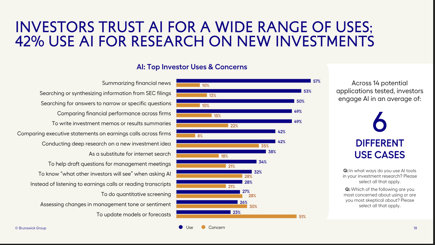 Brunswick finds that AI adoption is spread across a wide range of practical use cases. Nearly six in 10 investors reported using AI most frequently to summarize financial news. Just over half, or 53%, use AI to search or synthesize information from SEC filings, while 50% use it to narrow down or answer specific investment questions.